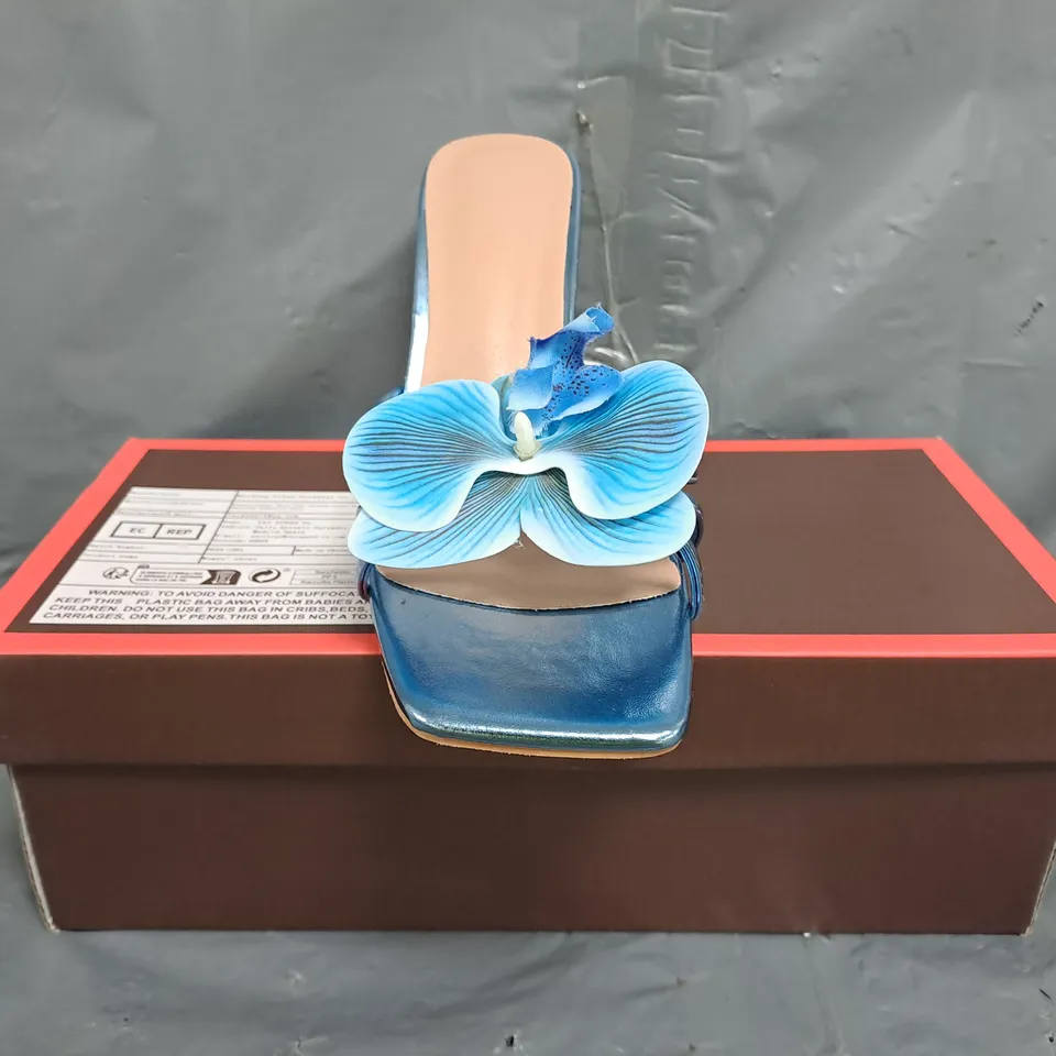 BOXED PAIR OF UNBRANDED OPEN TOE SANDALS IN BLUE W. GOLD EFFECT HEEL AND FLOWER DETAIL SIZE EU 39