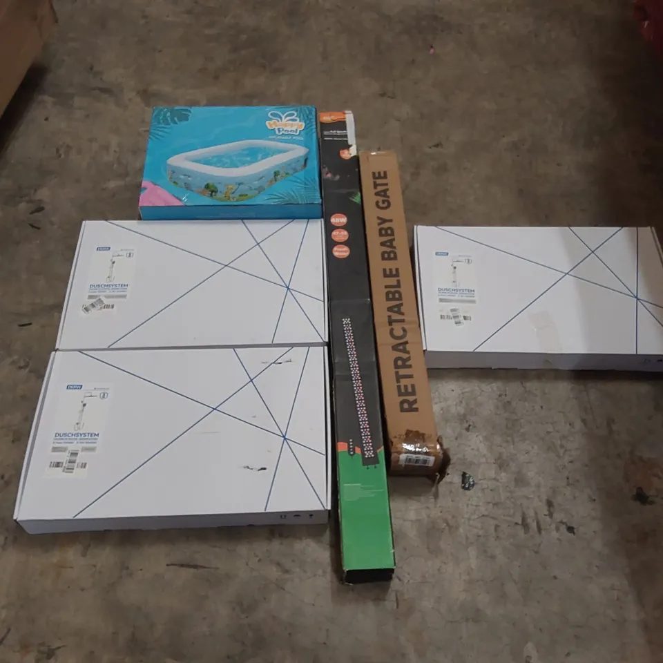 PALLET OF ASSORTED ITEMS INCLUDING: DERW SHOWER SYSTEMS, INFLATABLE POOL, RETRACTABLE GATE, LED AQUARIUM LIGHT ECT