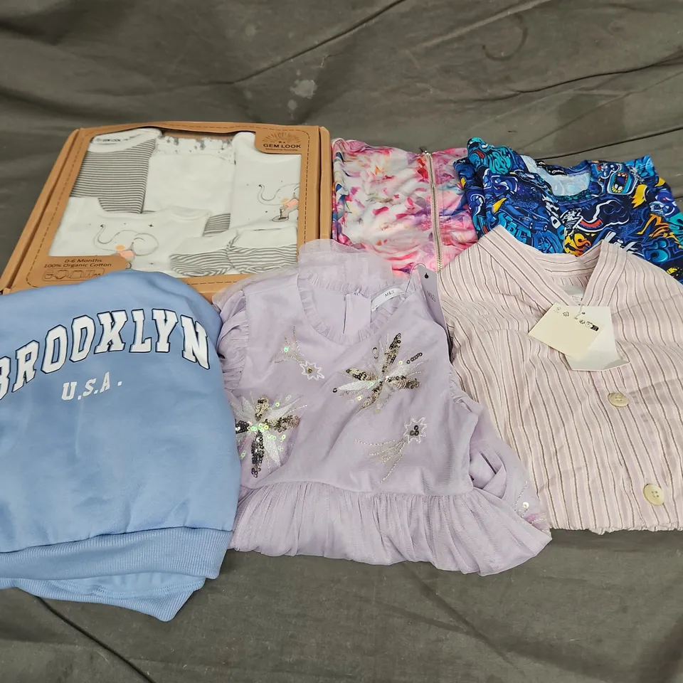 BOX OF APPROXIMATELY 30 ASSORTED KIDS CLOTHING ITEMS TO INCUDE - JAKCET - DRESS - BABY CLOTHES, ETC