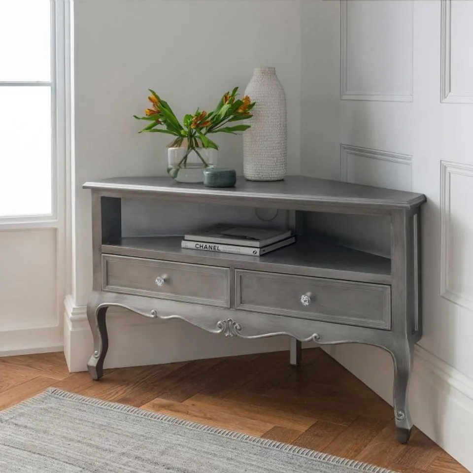 BRAND NEW BOXED HOMESDIRECT365 ANTIQUE FRENCH STYLE CORNER TV CABINET - SILVER