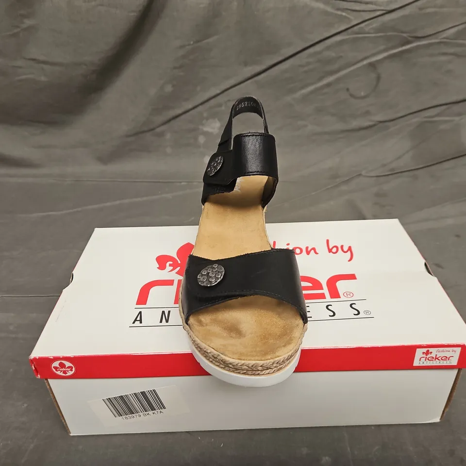 BOXED PAIR OF WOMENS RIEKER BLACK STRAP WEDGE SANDALS - UK SIZE 41