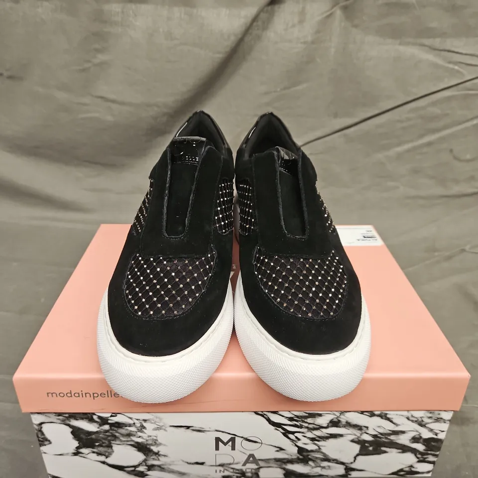 BOXED PAIR OF MODA IN PELLE BLACK SUEDE SLIP ON CHUNKY WEDGE TRAINERS - UK SIZE 40