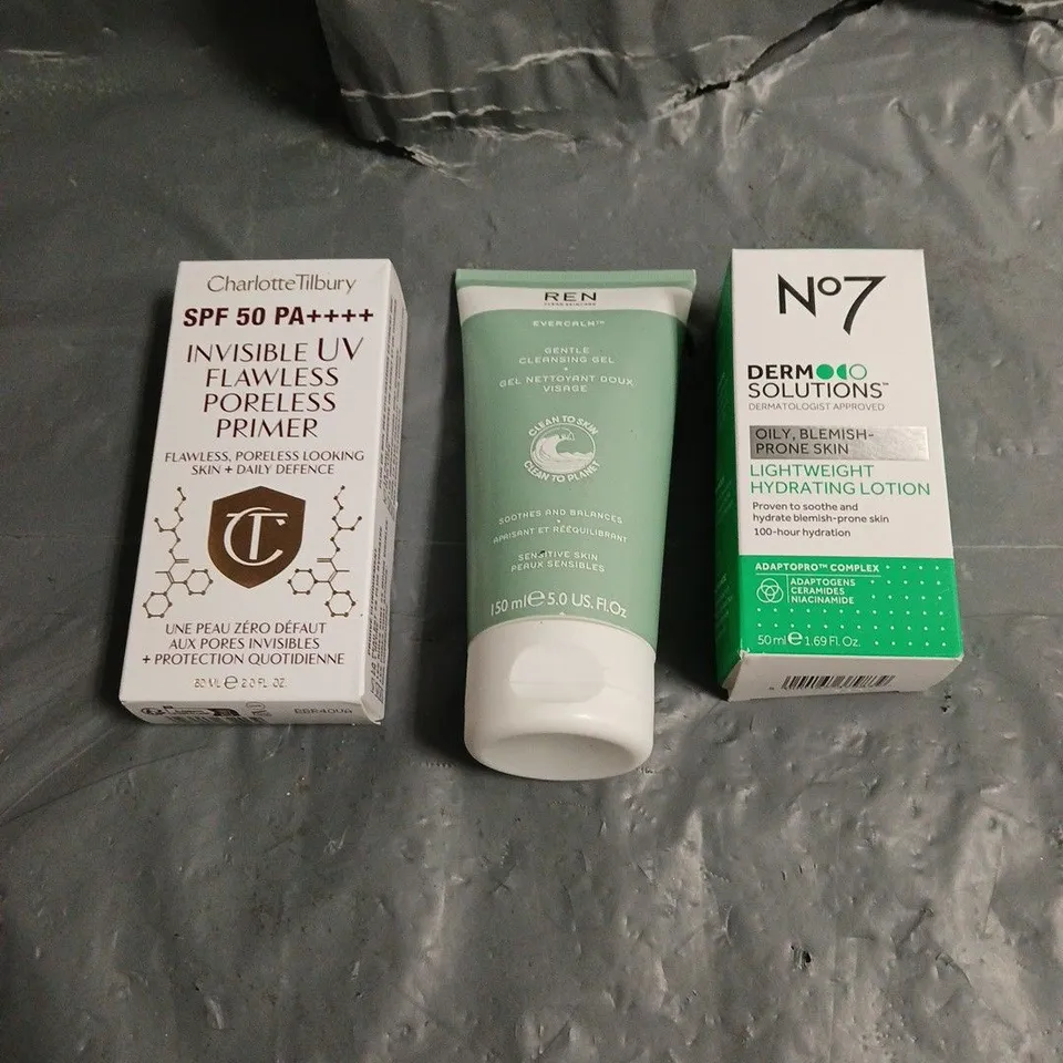 LOT OF 3 ASSORTED COSMETIC PRODUCTS TO INCLUDE N07 LIGHTWEIGHT HYDRATING LOTION, CHARLOTTE TILBURY INVISIBLE UV FLAWLESS PORELESS PRIMER, REN CLEAN SKINCARE GENTLE CLEANSING GEL, ETC