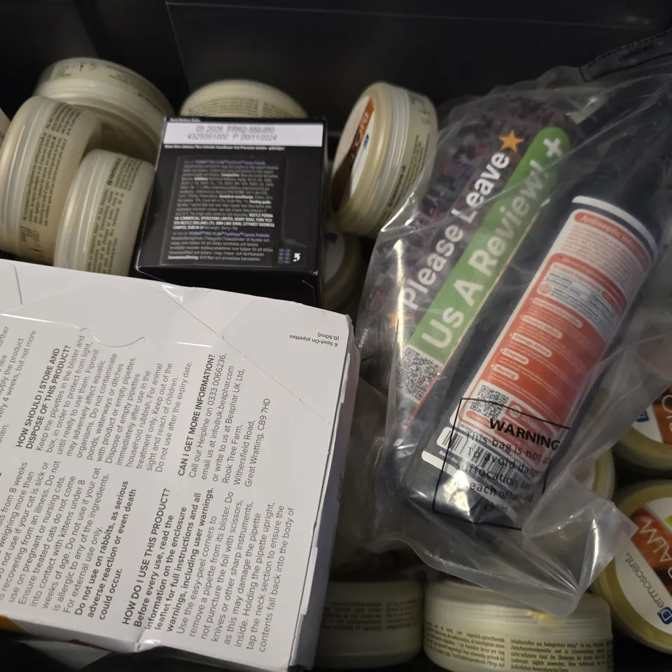 TOTE OF APPROXIMATELY 15 ASSORTED PET ITEMS TO INCLUDE -PLAQTIV WATER ADDITIVE , DERMOSCENT BIO BALM , PRODEN PLAQUE OFF POWDER ETC