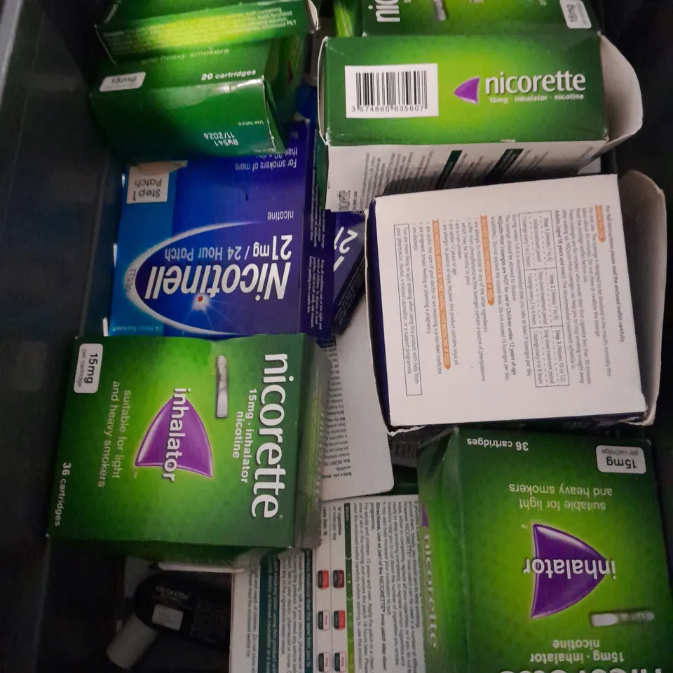 APPROXIMATELY 15 ASSORTED SMOKING PREVENTION AIDS TO INCLUDE NICORETTE GUM, NICOTINELL PATCHES, NICORETTE INHALATOR