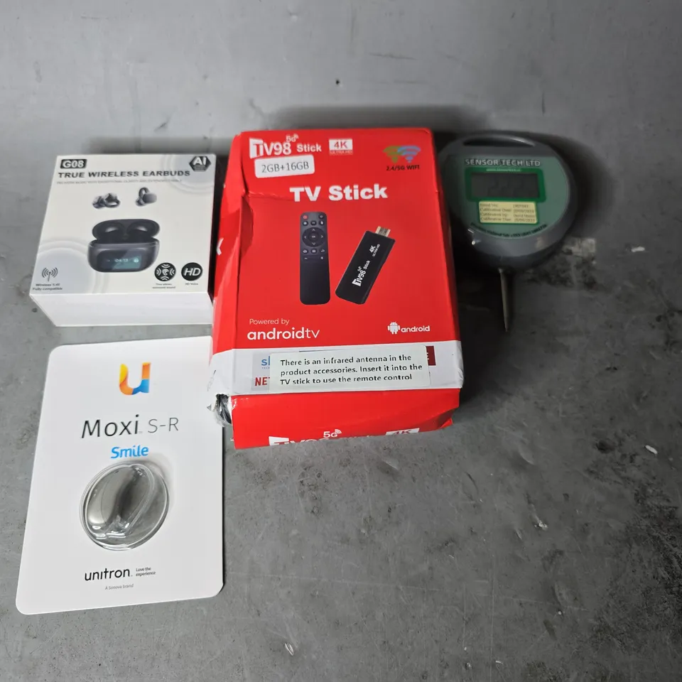APPROXIMATELY 12 ASSORTED ITEMS TO INCLUDE - TV STICK , MOXI-SR SMILE , TRUE WIRELESS EARBUDS ETC
