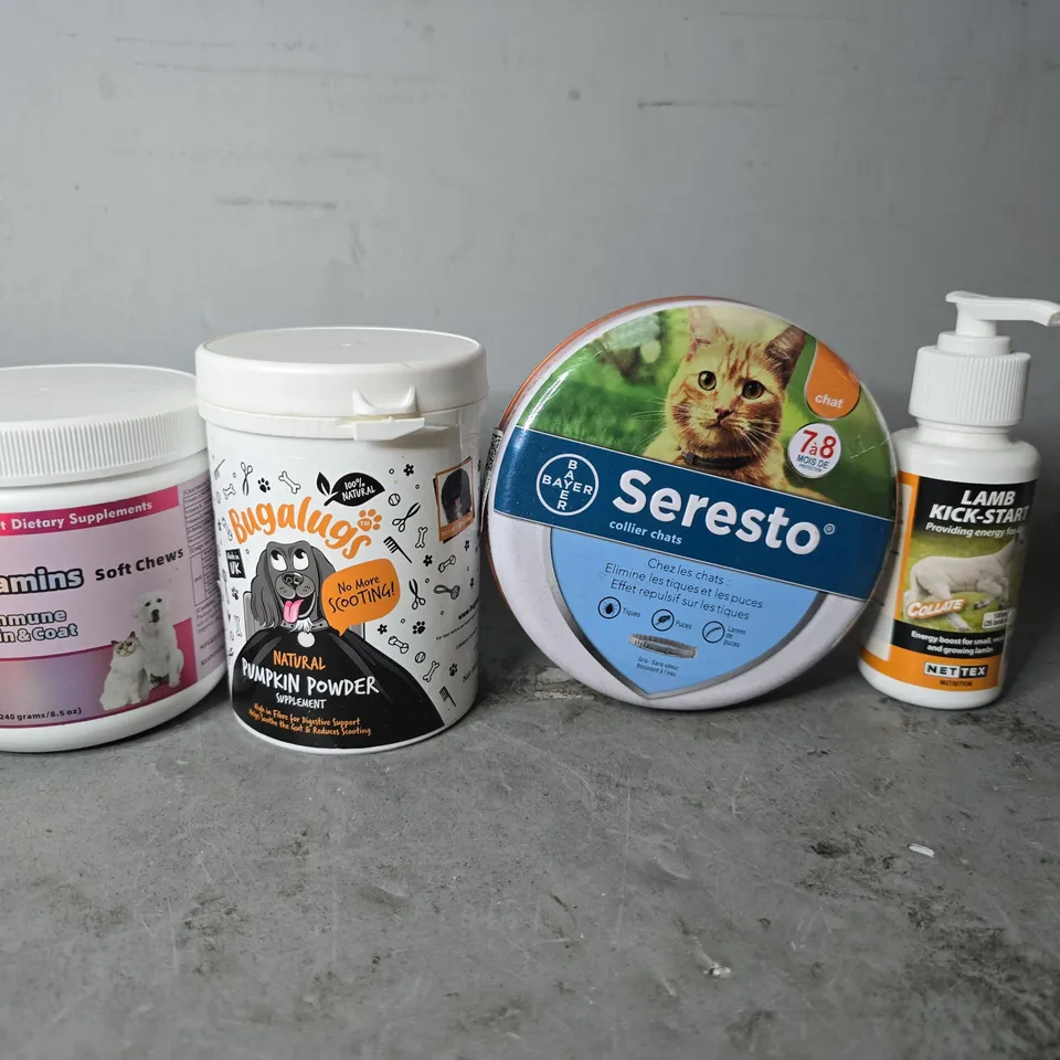 TOTE OF APPROXIMATELY 13 ASSORTED PET ITEMS TO INCLUDE -SERESTO , LAMB KICK STARTER , BUGALUGS PUMPKIN POWDER ETC