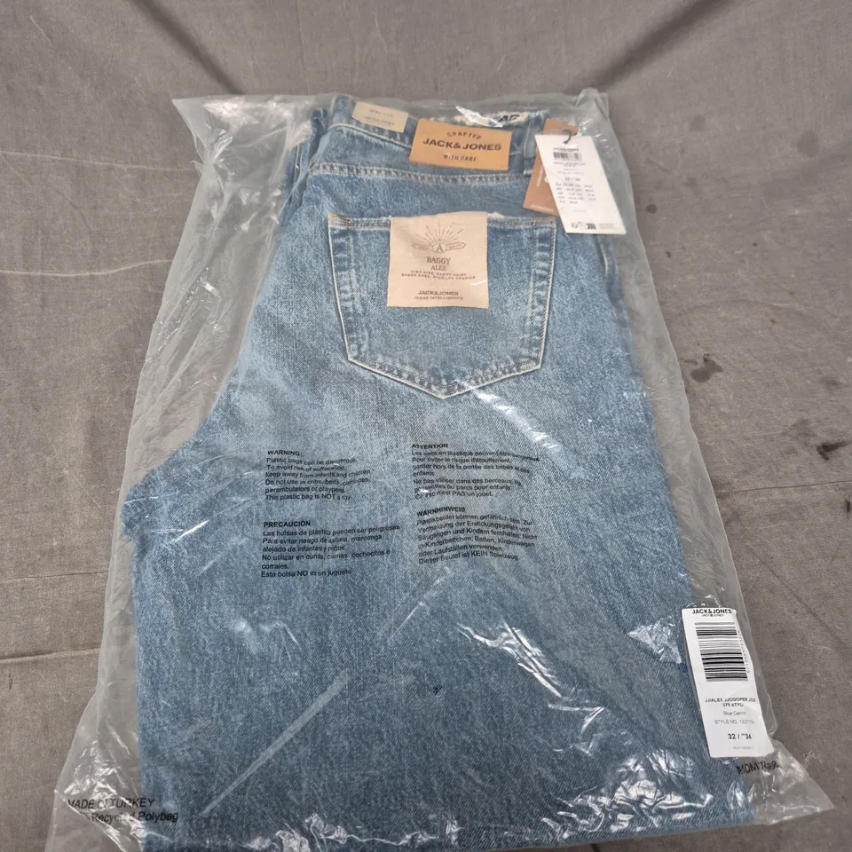 Men's Jack & Jones jeans in blue denim, style 'Baggy Alex'. Packaged in a clear plastic bag with brand and size labels visible. Only items shown in the images are included; packaging contents not verified.
