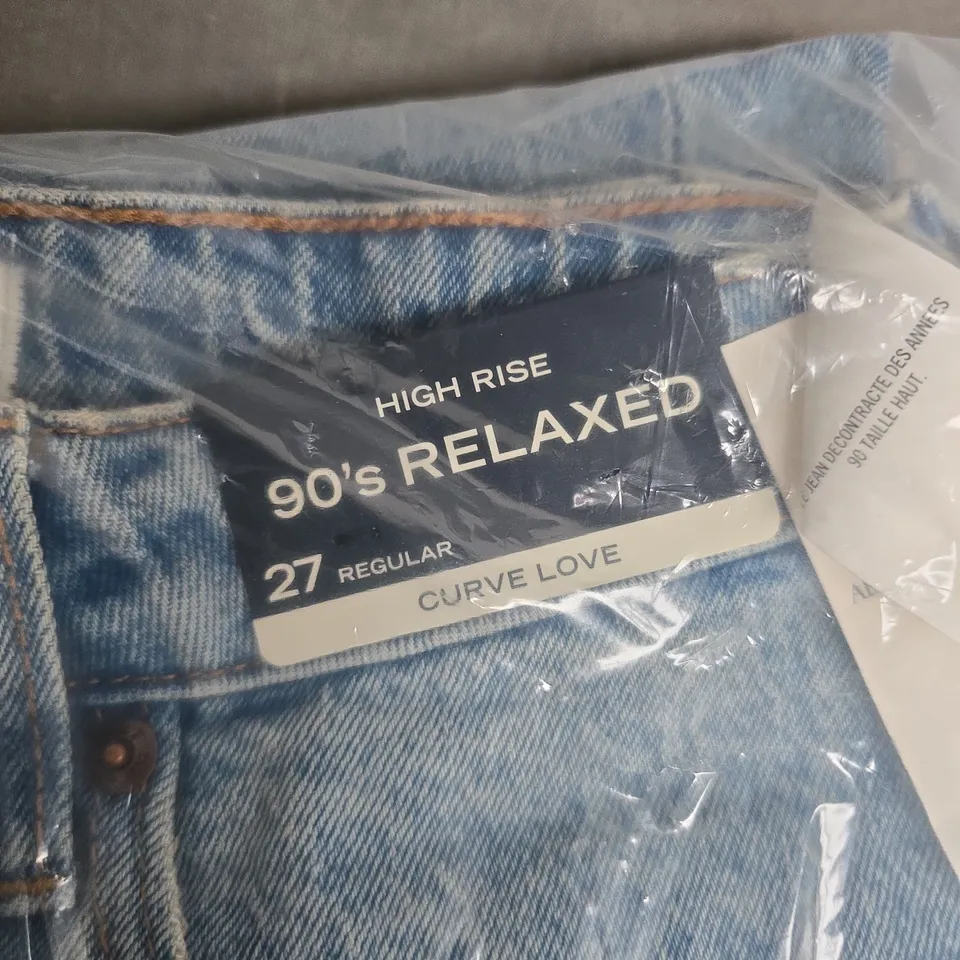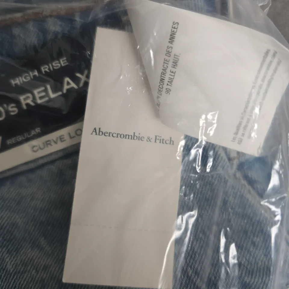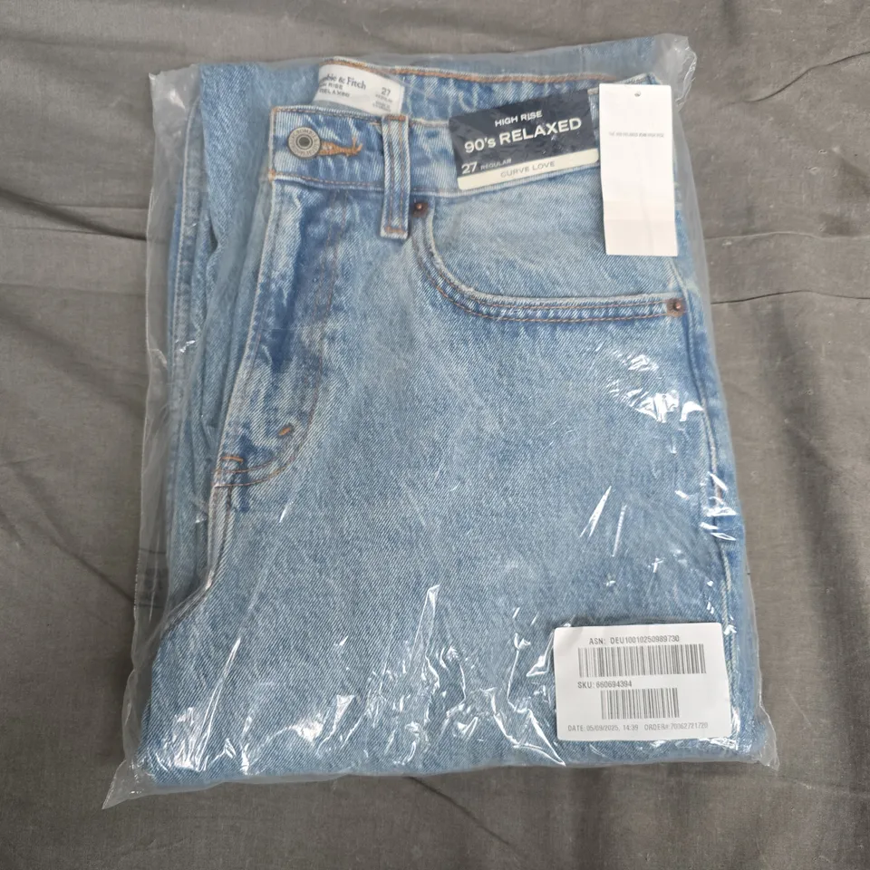 Blue denim jeans by Abercrombie & Fitch in the Curve Love, High Rise 90s relaxed fit. Brand tag attached; protected in clear packaging; size 27 Regular. Only items shown in the images are included; contents not verified.