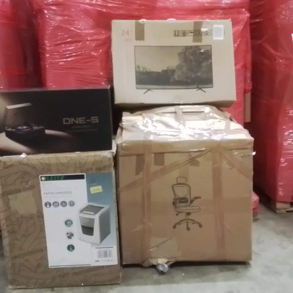 PALLET OF ASSORTED HOUSEHOLD GOODS AND PRODUCTS TO INCLUDE;ONE S RECORD PLAYER,24"TV,PAPER SHREDDER,OFFICE CHAIR