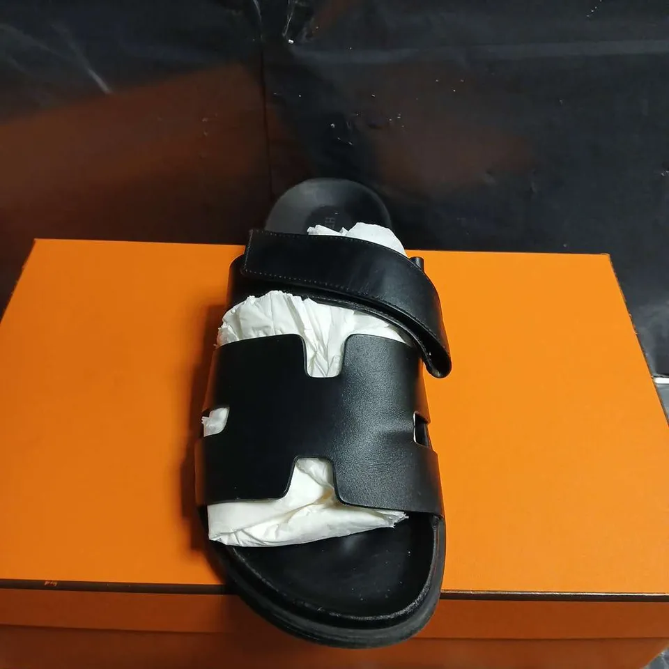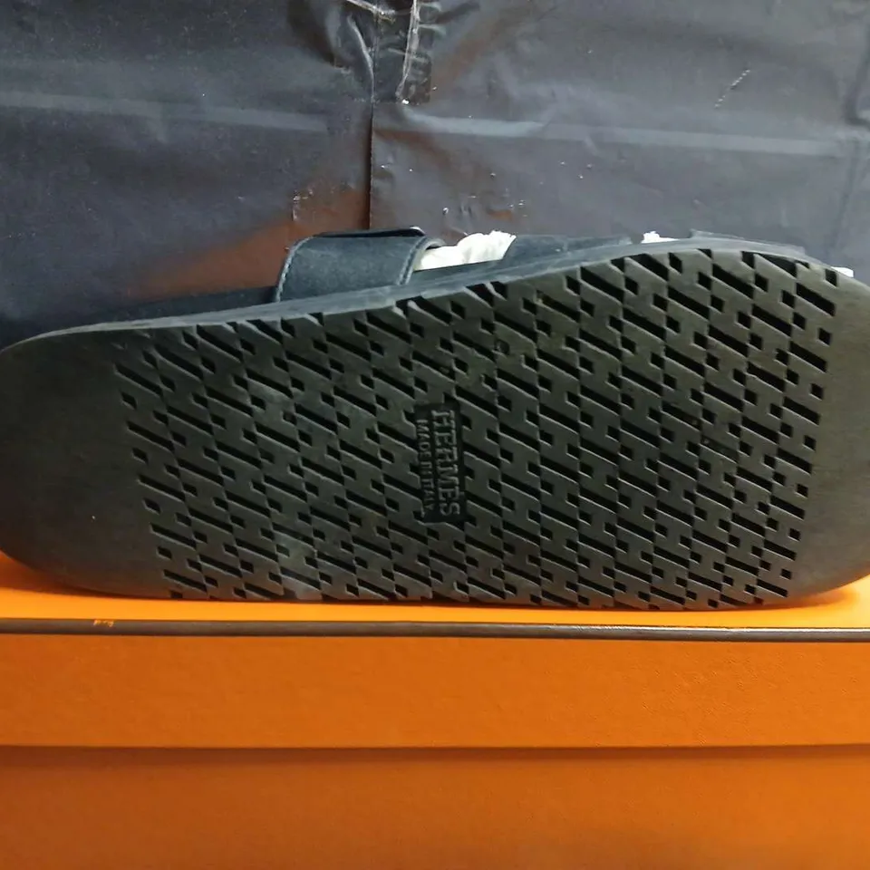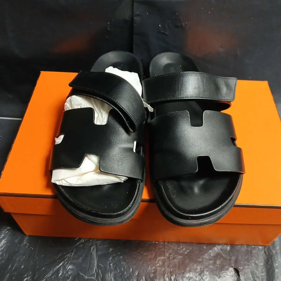 BOXED PAIR OF HERMÈS LEATHER SANDALS – BLACK, TWO-STRAP - SIZE UNSPECIFIED