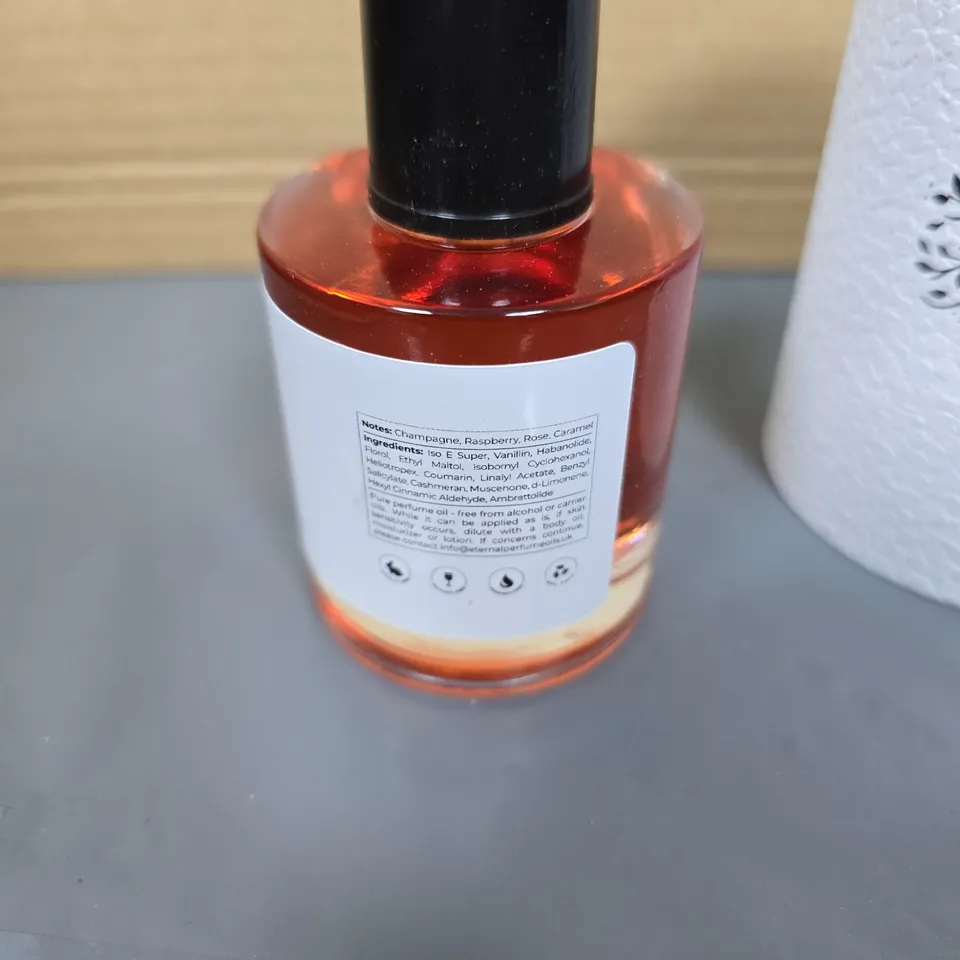 Pink Flirt perfume oil in a red liquid, with a black spray top and white label. Shown with a white textured circular case bearing 'ETERNAL' branding; Only items shown in the images are included.