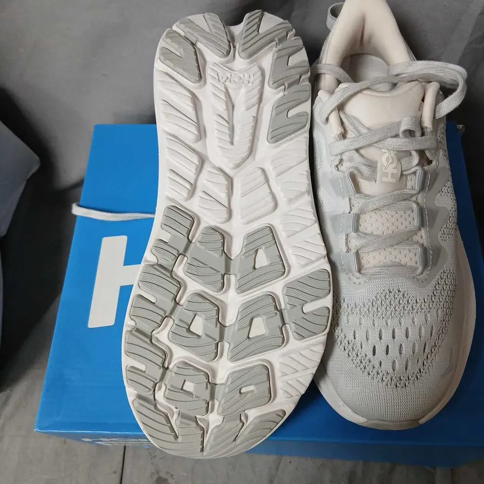 Hoka Kawana 2 women's running shoes in white. Supplied with original box; uppers and outsole appear clean with no obvious wear. Only items shown in the images are included.