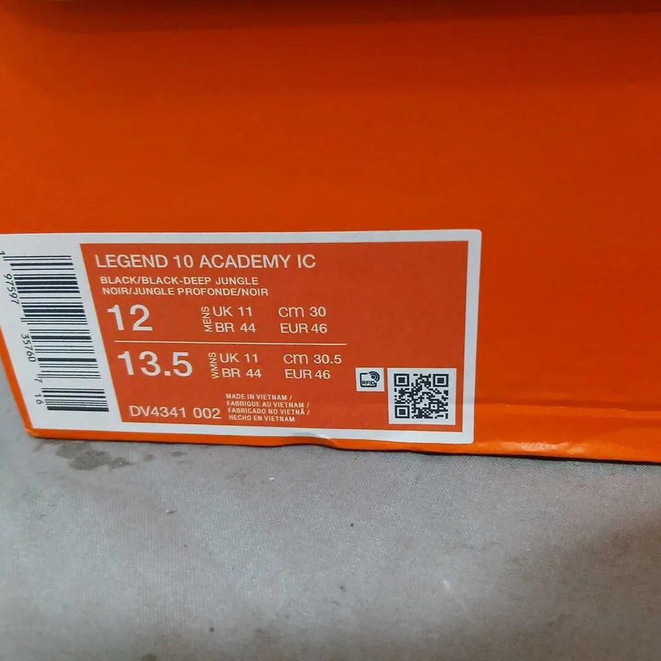 Nike Legend 10 Academy IC indoor football boots in black with a teal swoosh. Comes with the original orange box; size shown on the label as UK 11 (Men). Only items shown in the images are included; contents not confirmed.