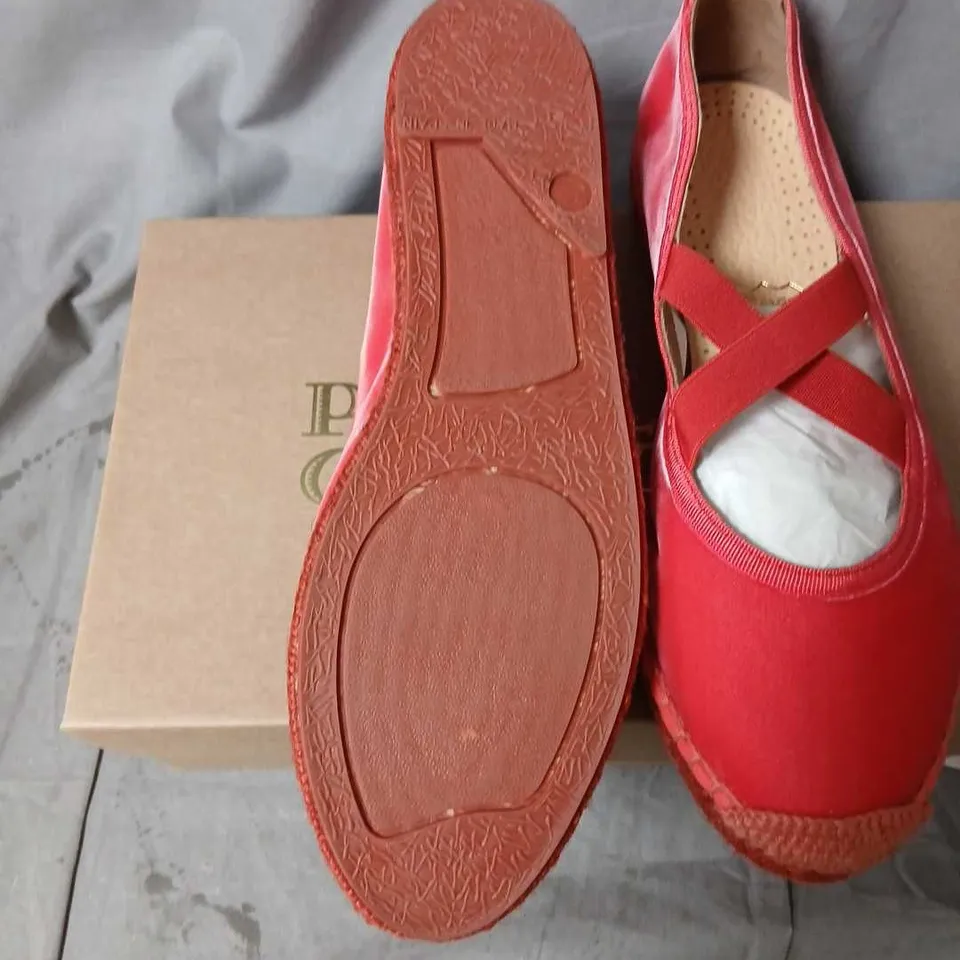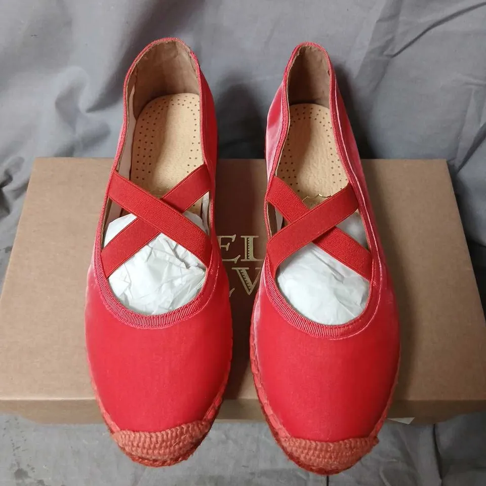 Pair of coral red velvet espadrille flats for women with a cross‑strap design and jute‑trimmed sole. Supplied with original box; size 38 (EU) / UK 5. Only items shown in the images are included.