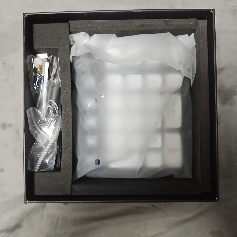 Outer box corners show light wear Main unit present, wrapped in protective bag within foam insert USB-C cable and small accessories included in packaging No functional testing performed