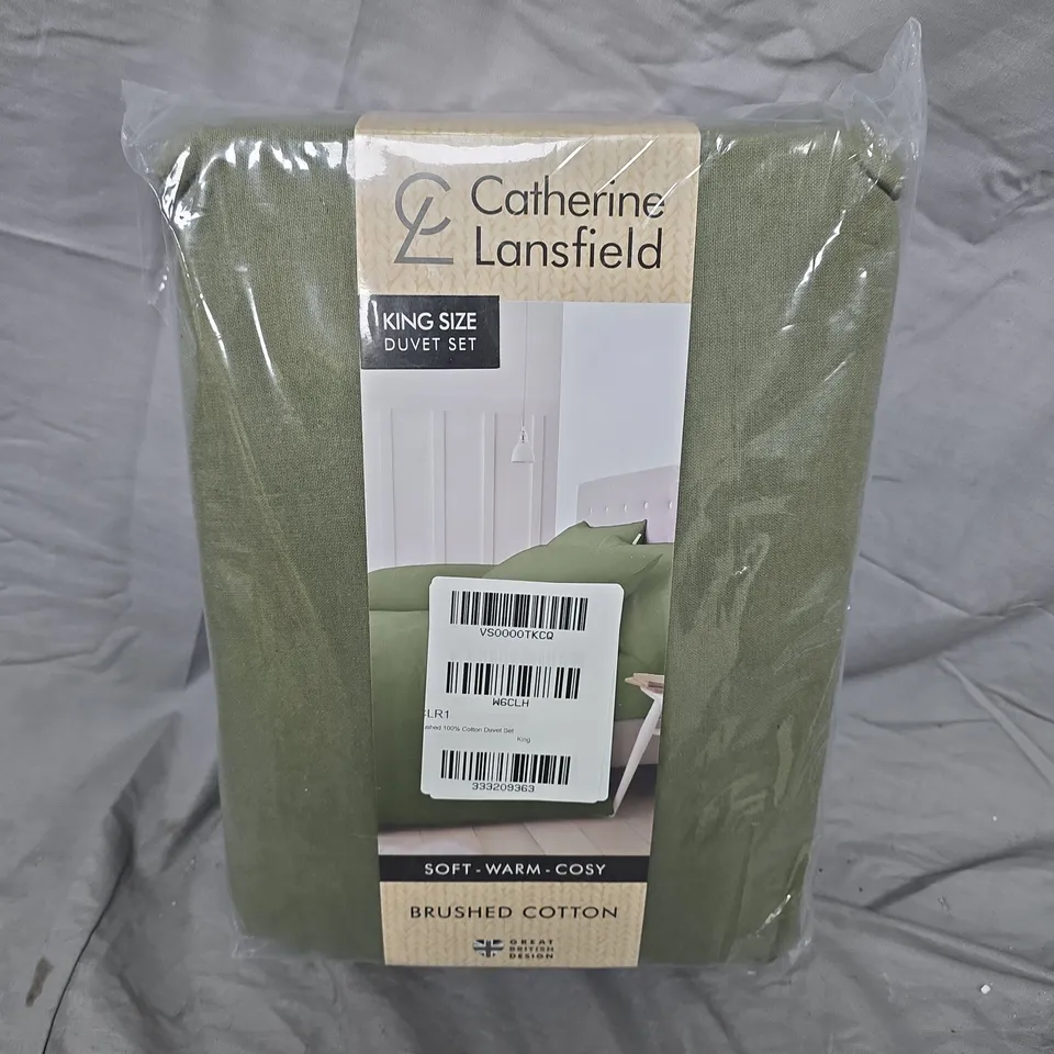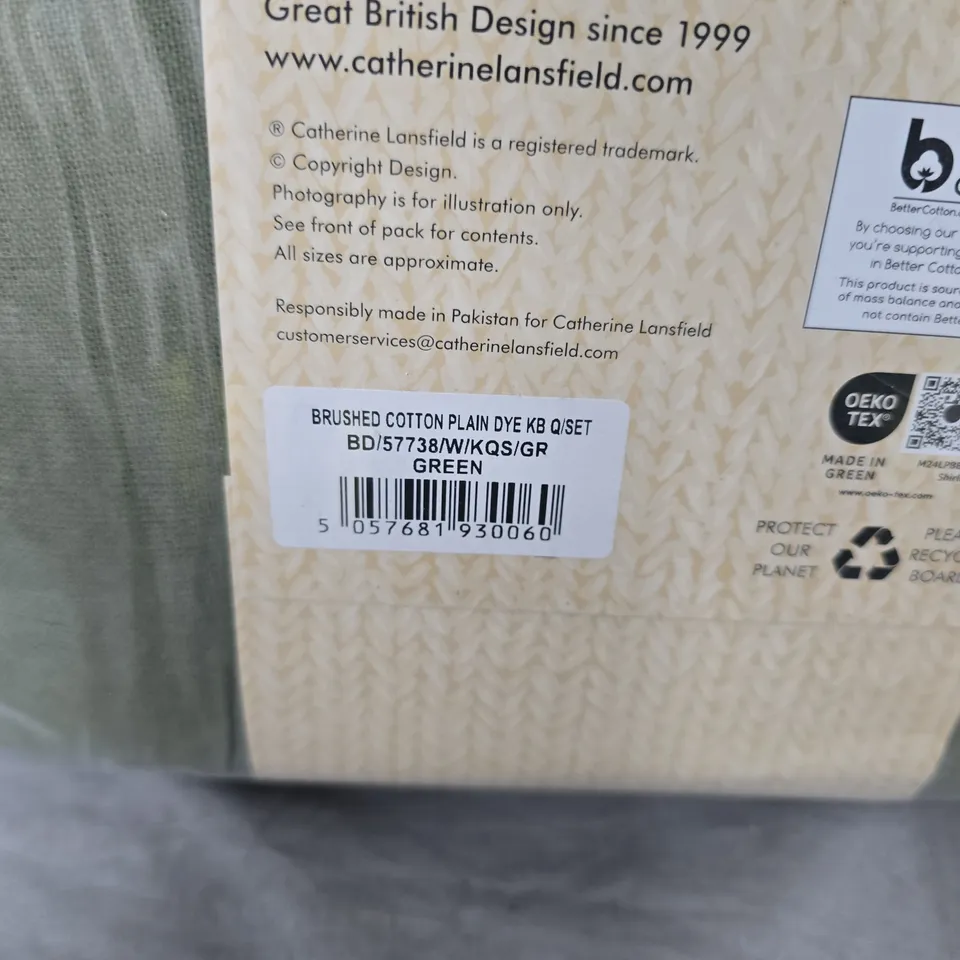 King size duvet set in green, brushed cotton by Catherine Lansfield. Supplied in original packaging; contents not verified. Only items shown in the images are included.