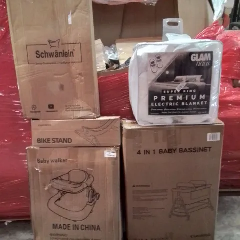 PALLET CONTAINING ASSORTED ITEMS TO INCLUDE: ELECTRIC PATIO HEATER, BABY WALKER, L-SHAPED DESK, FOLDING PLAYMAT, BABY WALKER ECT