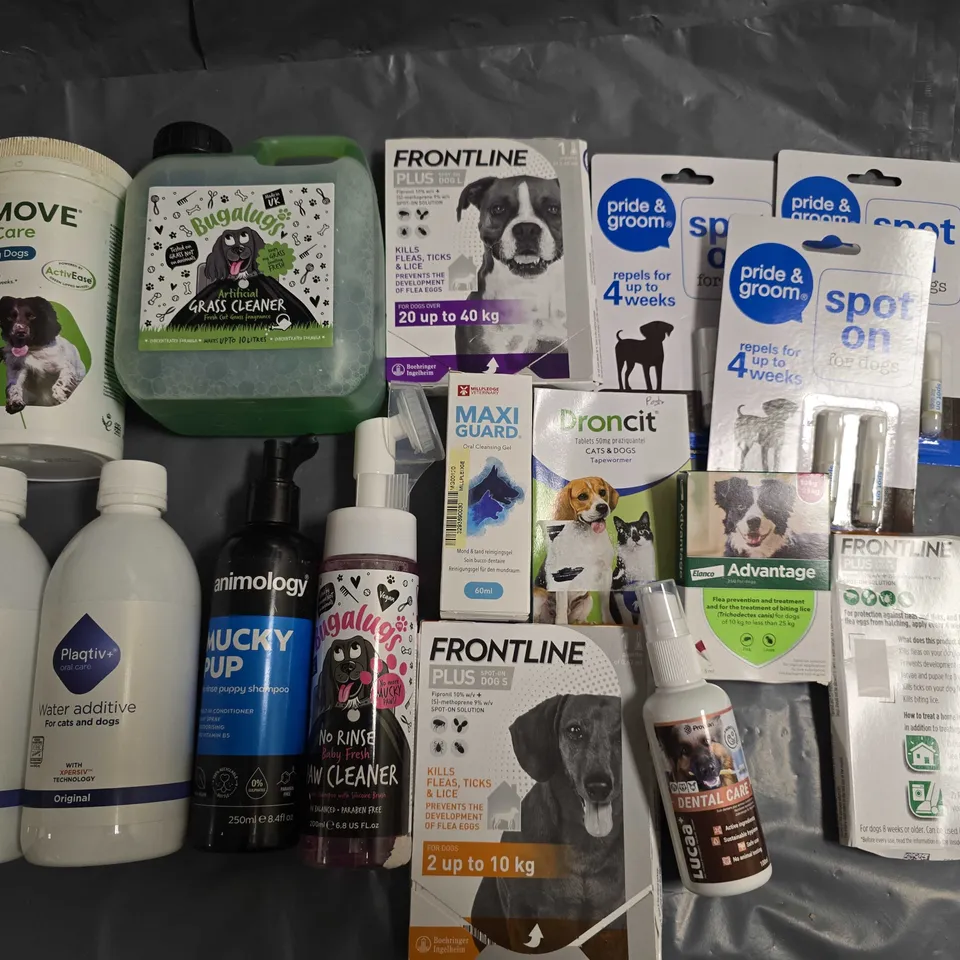 LOT OF ASSORTED PET CARE ITEMS TO INCLUDE FLEA DETERRENTS, PAW CLEANER AND WATER ADDITIVE