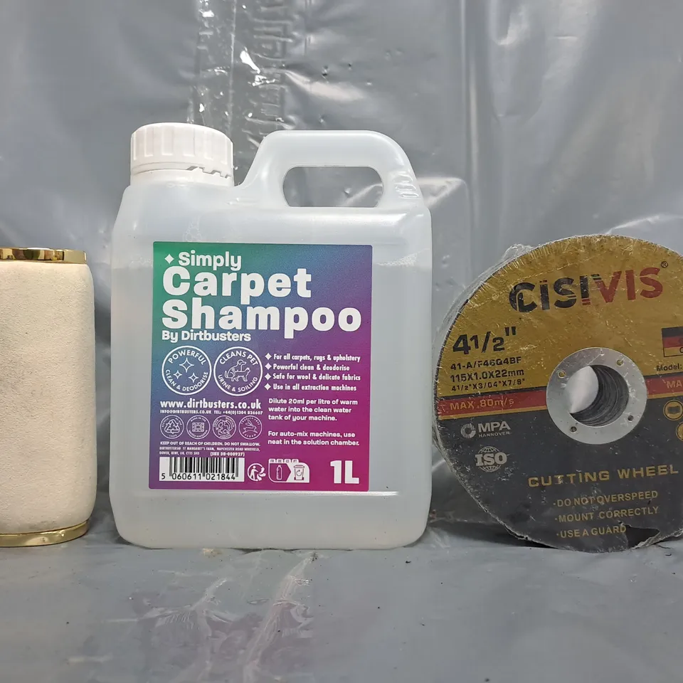 APPROXIMATELY 10 ASSORTED HOUSEHOLD ITEMS TO INCLUDE CISIVIS CUTTING WHEEL, CARPET SHAMPOO, ETC