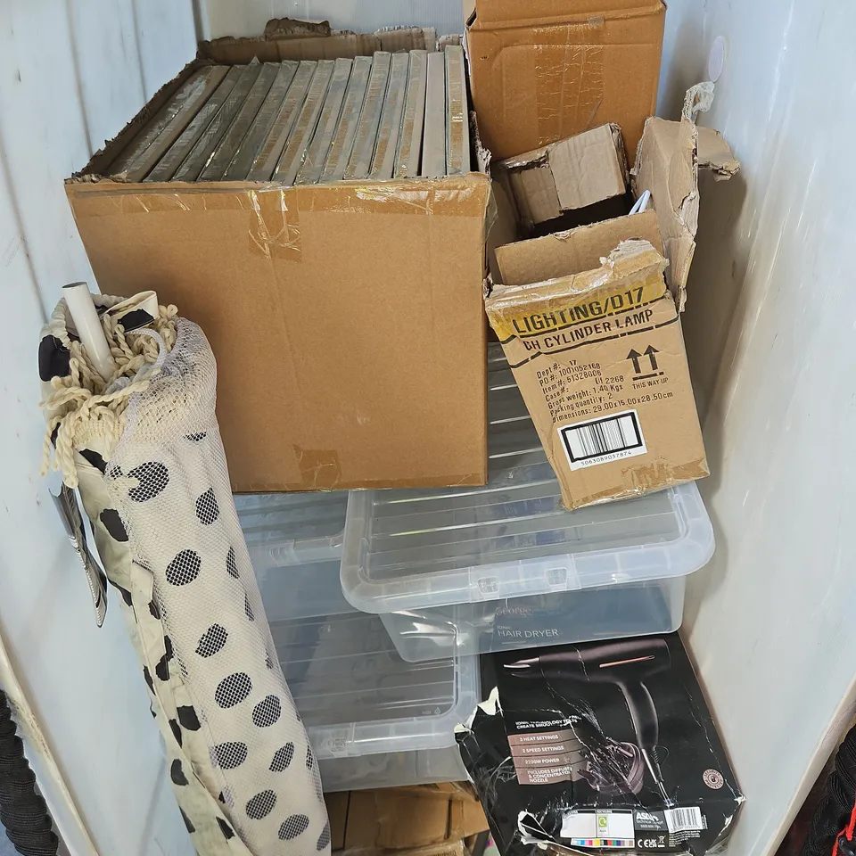 CAGE OF ASSORTED ITEM TO INCLUDE LAPS - HAIR DRYER - STORAGE BOXES / COLLECTION ONLY