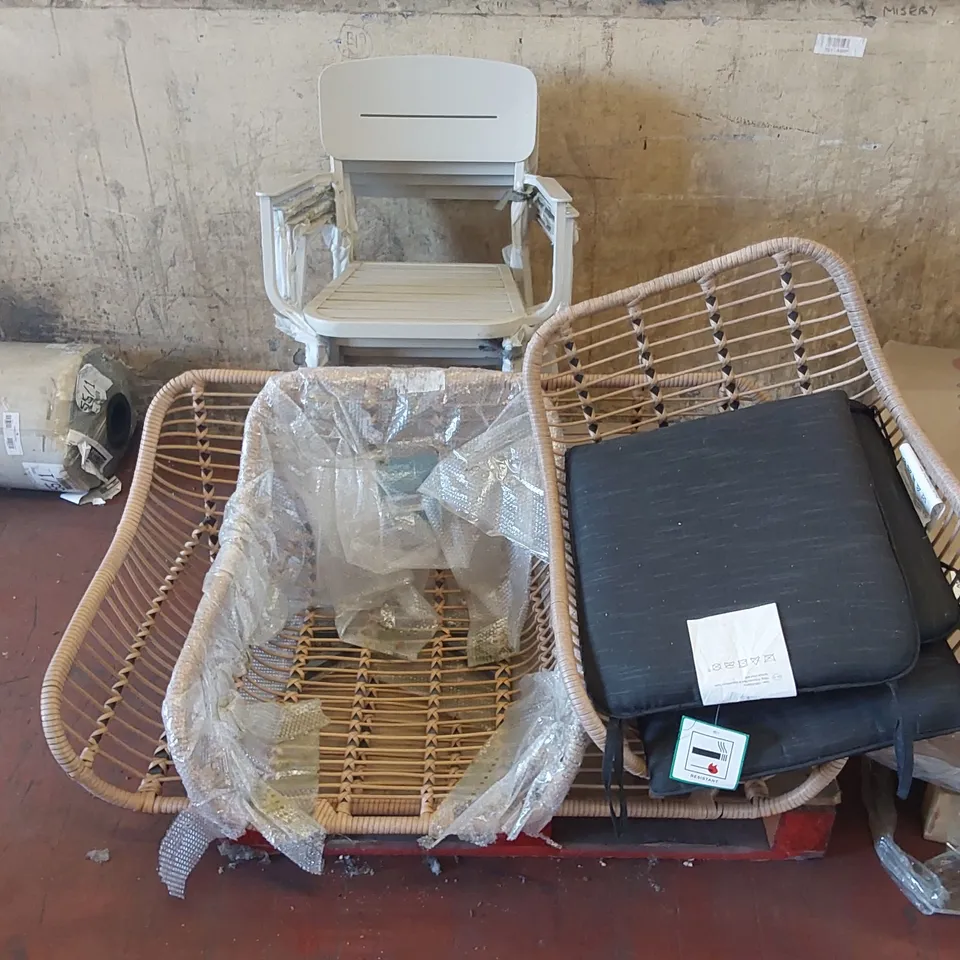 PALLET CONTAINING 4x STACKABLE CHAIRS AND OTHER ASSORTED OUTDOOR CHAIR PARTS
