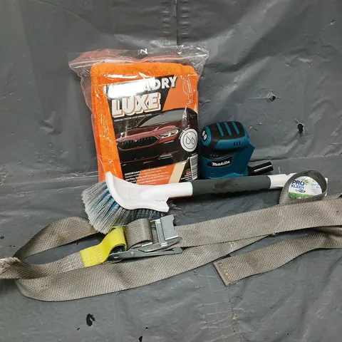 APPROXIMATELY 10 ASSORTED VEHICLE PARTS & ACCESSORIES TO INCLUDE RATCHET STRAPS, 5 TON HYDRAULIC JACK, CAR SCRATCH KIT, ETC - COLLECTION ONLY