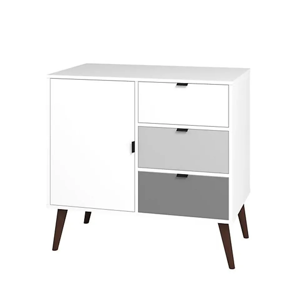 BRAND NEW BOXED OUT & OUT BOSTON WHITE SIDEBOARD WITH GREY ACCENT DRAWERS - 85cm X 44.5cm X 90cm