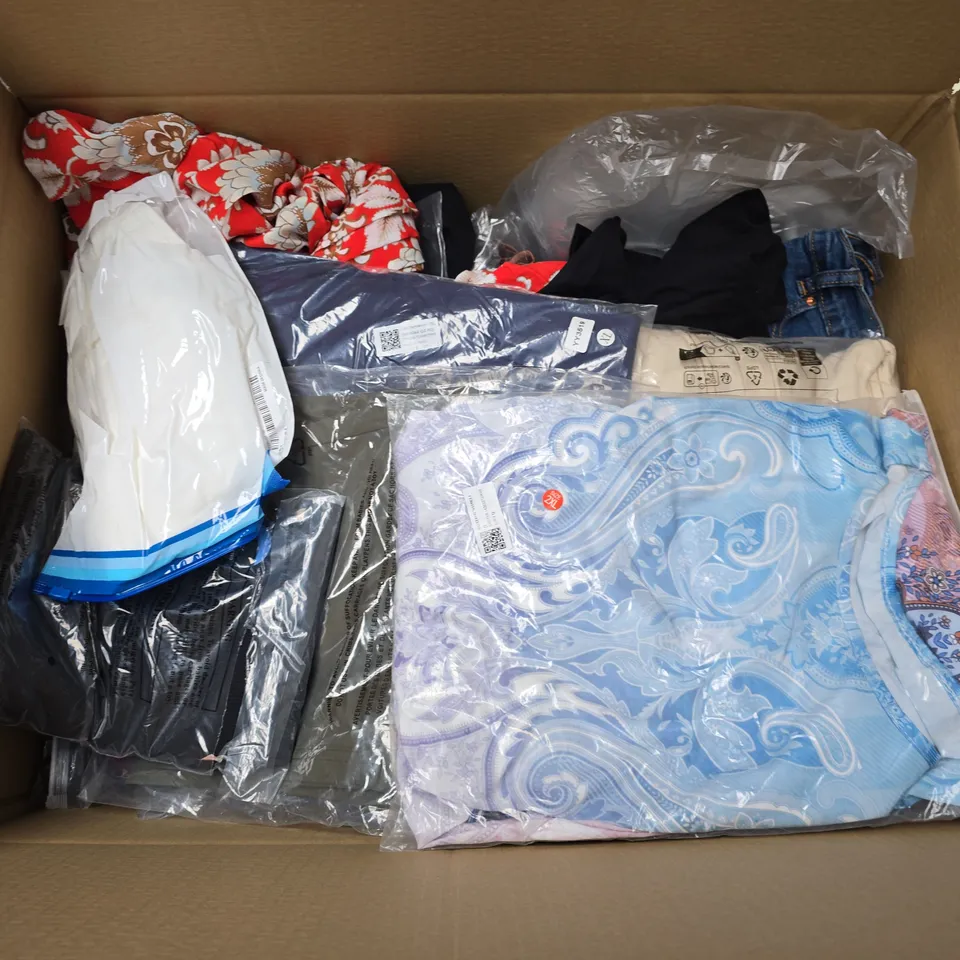 LARGE BOX OF APPROXIMATELY 20 ASSORTED CLOTHING ITEMS IN VARIOUS SIZES, STYLES AND COLOURS
