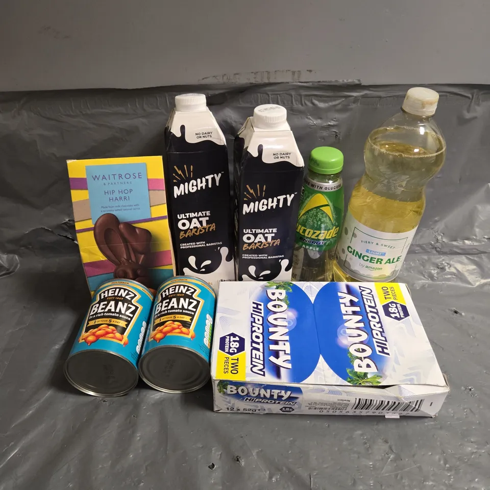 APPROXIMATELY 12 ASSORTED FOOD & DRINK ITEMS TO INCLUDE - MIGHTY OAT BARISTA DRINKS - BOUNTY HIGH PROTEIN BARS - LUCOZADE APPLE - ETC = COLELCTION ONLY