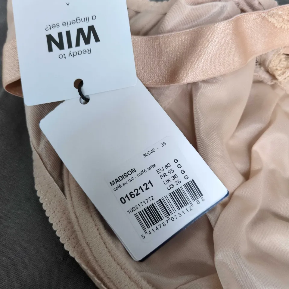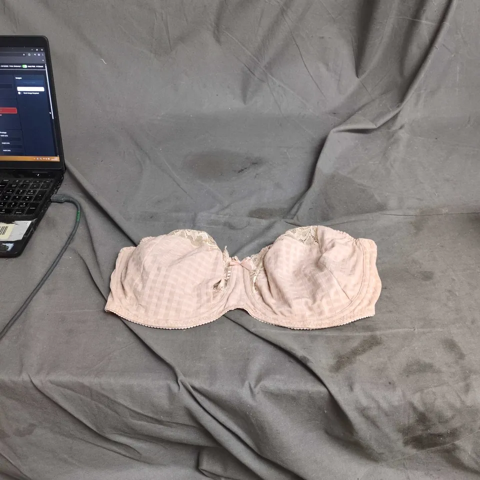 Tag attached and intact No visible stains, pulls or wear on cups/band Fabric appears clean with minor wrinkling from storage
