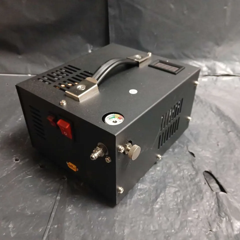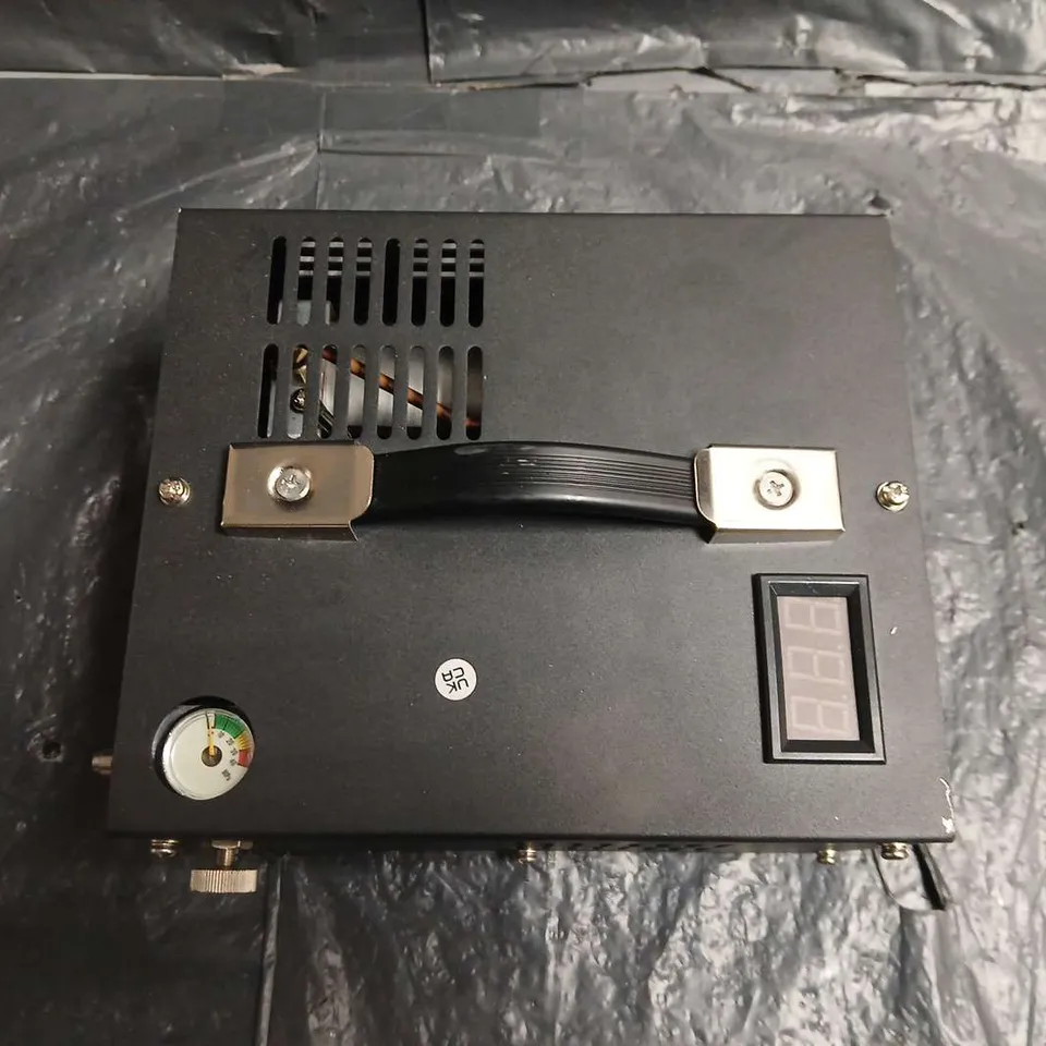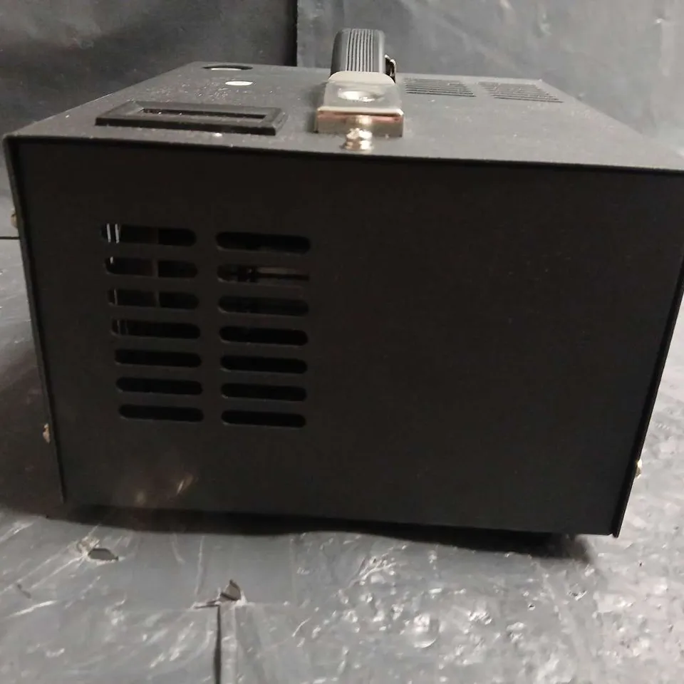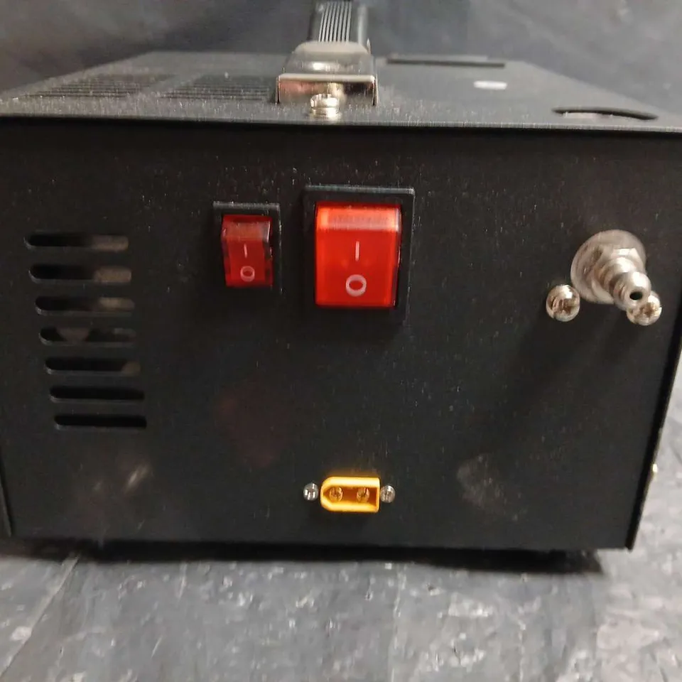 Unmarked black metal bench power supply / lab test equipment with a digital display and circular gauge. Only items shown in the images are included; internal contents not verified.