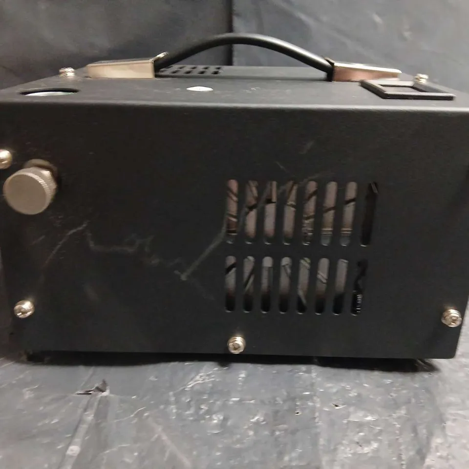 Front panel shows minor scratches and edge wear Ventilation slots contain dust; surface overall shows light wear Dual red on/off switches appear intact but untested Display not illuminated in images; not powered/tested No cables or accessories visible Carrying handle shows wear; metal brackets secured